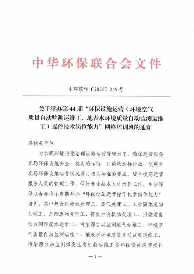 关于举办第44期“环保设施运营(环境空气质量自动监测运维工、地表水环境质量自动监测运维工)操作技术岗位能力”网络培训班的通知